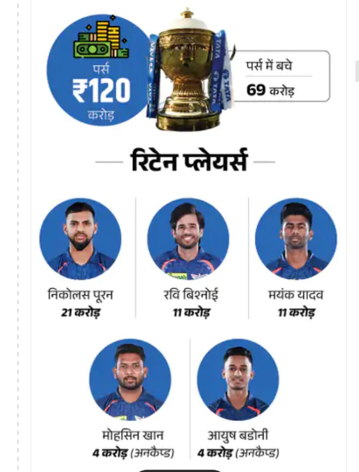 LSG ने भी पांच खिलाड़ियों को रिटेन किया है। इनमें निकोलस पूरन, मयंक यादव, आयुष बडोनी, मोहसिन खान और रवि बिश्नोई शामिल हैं। पूरन, मयंक और बिश्नोई कैप्ड खिलाड़ी हैं, जबकि मोहसिन और बदोनी अनकैप्ड खिलाड़ी हैं।