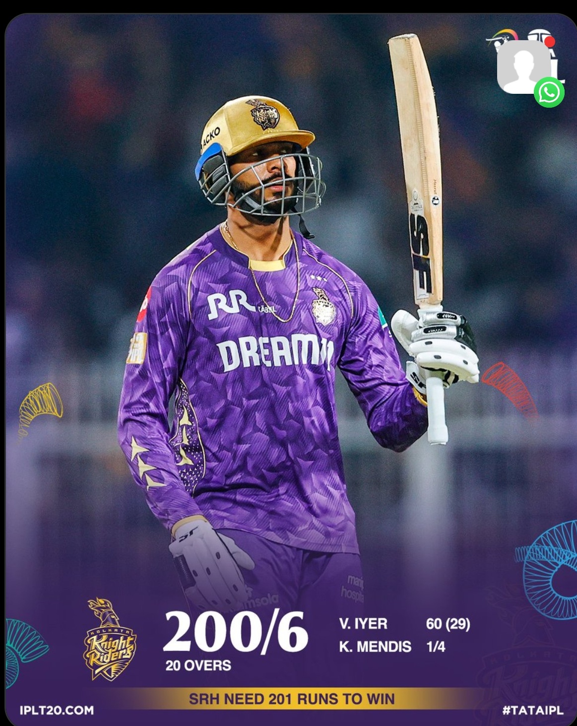 टॉस हारकर बैटिंग कर रही कोलकाता ने 20 ओवर में 6 विकेट खोकर 200 रन बनाए। वेंकटेश अय्यर ने 29 बॉल पर 60 रन बनाए। जबकि अंगकृष रघुवंशी ने 32 बॉल पर 50 रन बनाए। कप्तान अजिंक्य रहाणे 38 और रिंकू सिंह ने नाबाद 32 बनाए। 5 गेंदबाजों को एक-एक विकेट मिला।