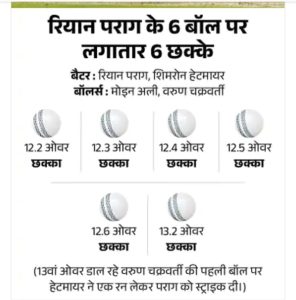 राजस्थान की ओर से कप्तान रियान पराग ने 45 बॉल पर 95 रन बनाए। उन्होंने लगातार 6 बॉल पर 6 छक्के लगाए। रियान ने मोइन अली के ओवर में 5 और वरुण चक्रवर्ती के ओवर में छठा छक्का लगाया। वे IPL इतिहास में लगातार 6 बॉल पर 6 छक्के लगाने वाले पहले बैटर बने। पराग के अलावा, यशस्वी जायसवाल ने 34, शिमरोन हेटमायर ने 29 रन और शुभम दुबे ने नाबाद 25 रन बनाए। मोइन अली, हर्षित राणा और वरुण चक्रवर्ती को 2-2 विकेट मिले।