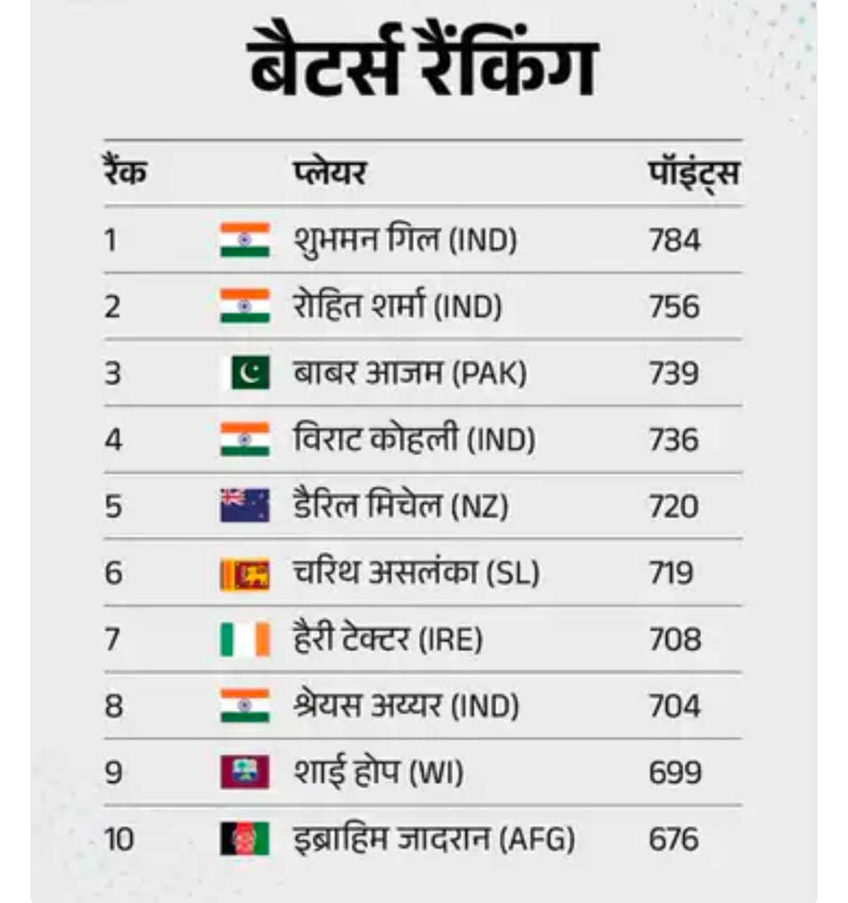 दुबई।ICC की जारी वनडे बैटर्स रैंकिंग के टॉप-10 में कोई बदलाव नहीं हुआ है। बुधवार को जारी वीकली रैंकिंग में भारतीय बैटर शुभमन गिल टॉप पर बने हुए है। वनडे कप्तान रोहित शर्मा दूसरे नंबर पर बरकरार हैं।रैंकिंग में ऑस्ट्रेलिया के ट्रेविस हेड, मिचेल मार्श और कैमरन ग्रीन को फायदा हुआ है। हेड एक स्थान बढ़कर 11वें, मार्श चार स्थान चढ़कर 44वें और ग्रीन 44 स्थान की बड़ी छलांग लगाकर 78वें नंबर पर पहुंच गए हैं।