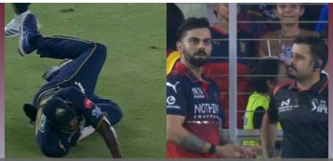 रॉयल चैलेंजर्स बेंगलुरु ने इस मुकाबले में 7 ओवर्स में दो विकेट के नुकसान पर 71 रन बना लिए थे, जिसमें गुजरात टाइटंस की तरफ से पारी का 8वां ओवर फेंकने आए अरशद खान के इस ओवर की पहली तीन गेंदों में रजत पाटीदार ने 8 रन बना लिए थे। इसके बाद चौथी गेंद पर उन्होंने डीप बैकवर्ड स्क्वायर लेग पर शॉट खेला जिसमें वह हवा में काफी ऊंचा गया था। इस दौरान वहां पर फील्डिंग कर रहे जेसन होल्डर ने दौड़ लगाने के साथ गेंद को डाइव लगाते हुए लपक लिया। हालांकि इस दौरान उन्होंने जिस हाथ से कैच लपका वह स्लाइड करने के साथ मैदान से भी लगा हुआ था।फील्ड अंपायर ने इस कैच को चेक करने के लिए फैसला तीसरे अंपायर की तरफ भेजा जिसमें उन्होंने रिप्ले देखने के बाद रजत पाटीदार को आउट करार दे दिया। ऐसे डग आउट में बैठे विराट कोहली फैसले को लेकर काफी नाराज नजर आए जिसमें वह पास में खड़े चौथे अंपायर के पास इस फैसले पर अपनी नाखुशी जाहिर करते हुए दिखाई दिए जिसमें उनके अलावा आरसीबी टीम के हेड कोच एंडी फ्लावर भी वहां पर मौजूद थे। रजत पाटीदार इस मुकाबले में 15 गेंदों का सामना करने के बाद दो चौके और एक छक्के की मदद से 19 रनों की पारी खेलने के बाद पवेलियन लौट गए।