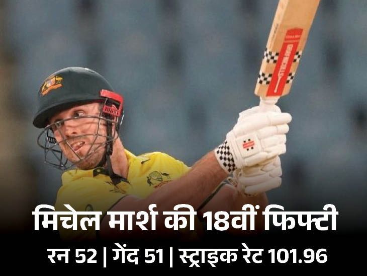 मिचेल मार्श ने वनडे वर्ल्ड कप में पहली फिफ्टी जमाई है। यह उनके वनडे करियर की 18वीं हाफ सेंचुरी भी है। मार्श ने 39 बॉल पर फिफ्टी पूरी की। उन्होंने 51 बॉल पर 101.96 के स्ट्राइक रेट से 52 रन बनाए। उनकी पारी में 9 चौके शामिल रहे।