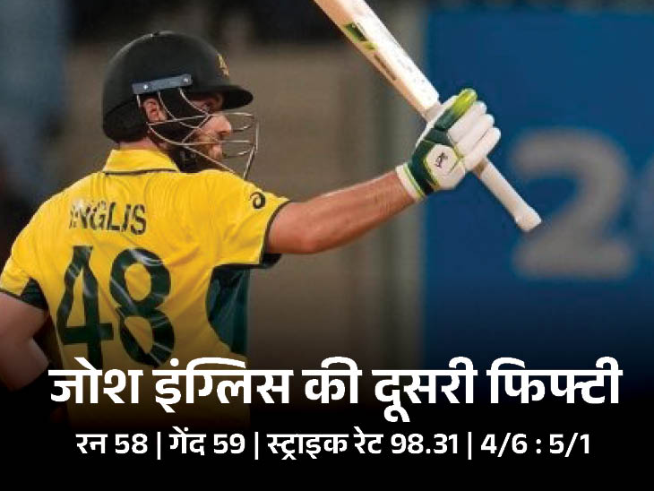 जोश इंग्लिस ने वनडे करियर का दूसरा अर्धशतक जमाया। यह उनका पहला वर्ल्ड कप अर्धशतक है। उन्होंने 59 बॉल पर 98.31 के स्ट्राइक रेट से 58 रन बनाए। इंग्लिस की पारी में 5 चौके और एक छक्का शामिल रहा।