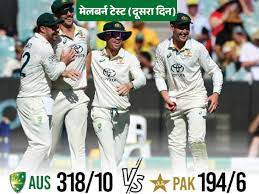 मेलबर्न|ऑस्ट्रेलिया और पाकिस्तान के बीच टेस्ट सीरीज का दूसरा मुकाबला मेलबर्न में खेला जा रहा है। दूसरे दिन का खेल खत्म होने तक पाकिस्तान ने अपनी पहली पारी में 6 विकेट पर 194 रन बनाए हैं। कप्तान शान मसूद और ओपनर अब्दुल्लाह शफीक ने फिफ्टी लगाई। जबकि बाबर आजम एक रन ही बना सके। मोहम्मद रिजवान 29 और आमिर जमाल 2 रन बनाकर नाबाद लौटे।