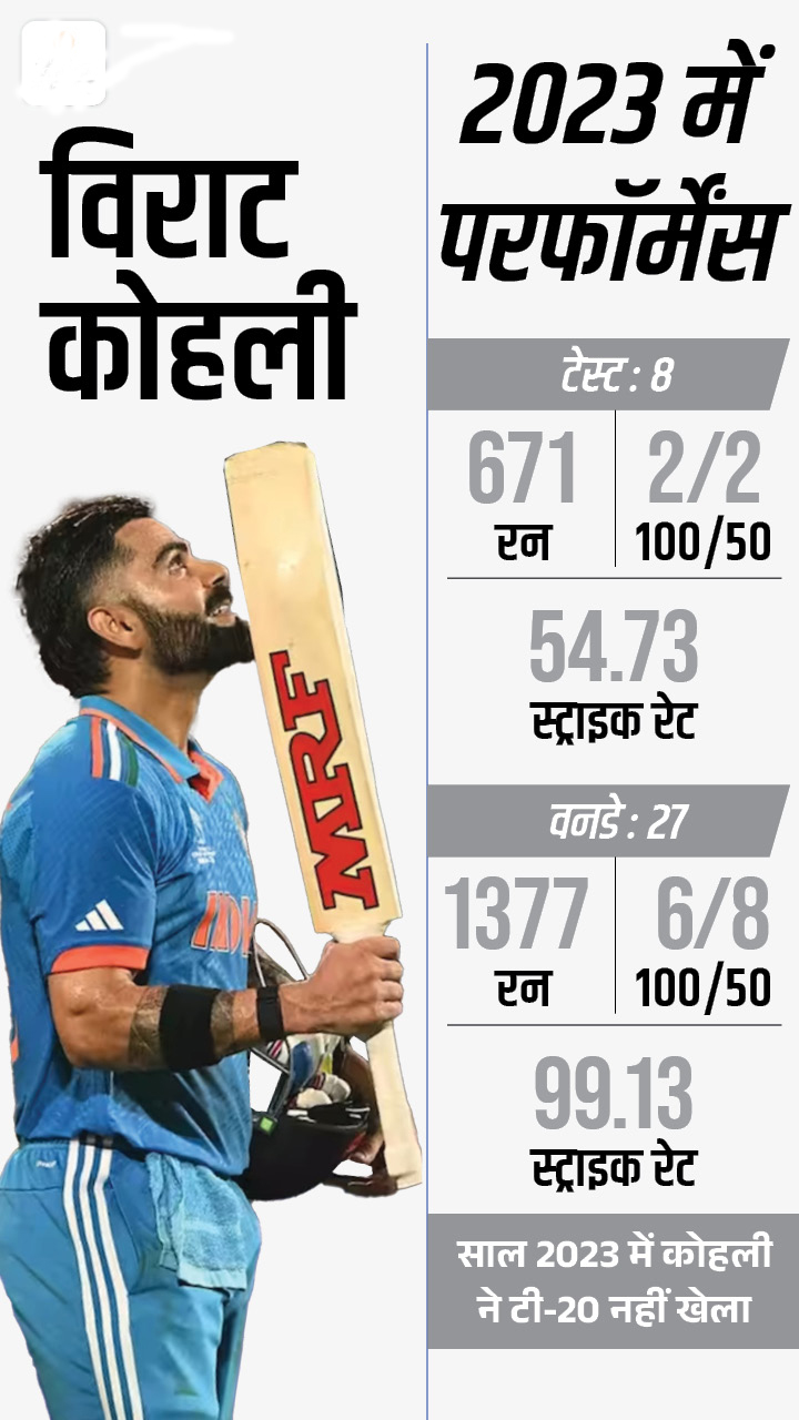विराट ने भारत के लिए साल 2023 में सबसे ज्यादा 8 सेंचुरी भी जमाई। वहीं, वर्ल्ड कप में उनके शानदार प्रदर्शन ने भारत को फाइनल तक पहुंचने में मदद की। इस बल्लेबाज ने 765 रन बनाए, जो वर्ल्ड कप के किसी भी एक एडिशन में किसी भी खिलाड़ी द्वारा बनाए गए सर्वाधिक रन हैं।
