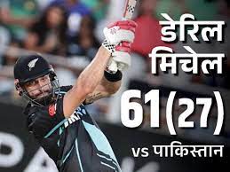 मिचेल ने 27 बॉल पर 61 रन की पारी खेली। यह उनके टी-20 इंटरनेशनल करियर का छठा और पाकिस्तान के खिलाफ दूसरा अर्धशतक रहा। उन्होंने विलियमसन के साथ तीसरे विकेट के लिए 78 रनों की साझेदारी भी निभाई। वहीं कप्तान विलियमसन ने भी शानदार बैटिंग करते हुए इस मैच में पहले 40 गेंदों पर अर्धशतक पूरा किया और फिर वह 57 रन बनाकर आउट हुए। ये उनके टी-20 इंटरनेशनल करियर की 18वां अर्धशतक है। इन दोंनो खिलाड़ियों को अलावा फिन एलन ने 34 रन और चैपमैन ने 26 रन की पारी खेली।