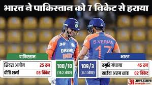 इस तरह टीम इंडिया ने जीत के साथ टूर्नामेंट में आगाज किया है। लक्ष्य का पीछा करते हुए टीम इंडिया के लिए स्मृति मंधाना ने 45 और शेफाली वर्मा ने 40 रनों का योगदान दिया।टीम इंडिया ने पाकिस्तान के खिलाफ तेज तर्रार शुरुआत करते हुए पारी के 10 ओवर में 1 विकेट गंवाकर 86 रन बना लिए।  पाकिस्तान के द्वारा दिए 109 रनों के लक्ष्य का पीछा करने उतरी टीम इंडिया के लिए शेफाली वर्मा और स्मृति मंधाना ने तूफानी शुरुआत की। दोनों ने मिलकर पहले 5 ओवर में बिना कोई विकेट गंवाए 42 रन बना लिए।भारत के खिलाफ एशिया कप के पहले मैच में पाकिस्तान की टीम ने पहले बल्लेबाजी करते हुए 19.2 ओवर में 108 रन बनाकर सिमट गई।  भारत के लिए बॉलिंग में सबसे ज्यादा विकेट दीप्ति शर्मा ने लिए। दीप्ति के खाते में तीन विकेट आया। इसके अलावा रेणुका ठाकुर, श्रेयंका पाटिल और पूजा वस्त्राकर ने दो-दो विकेट लिए।